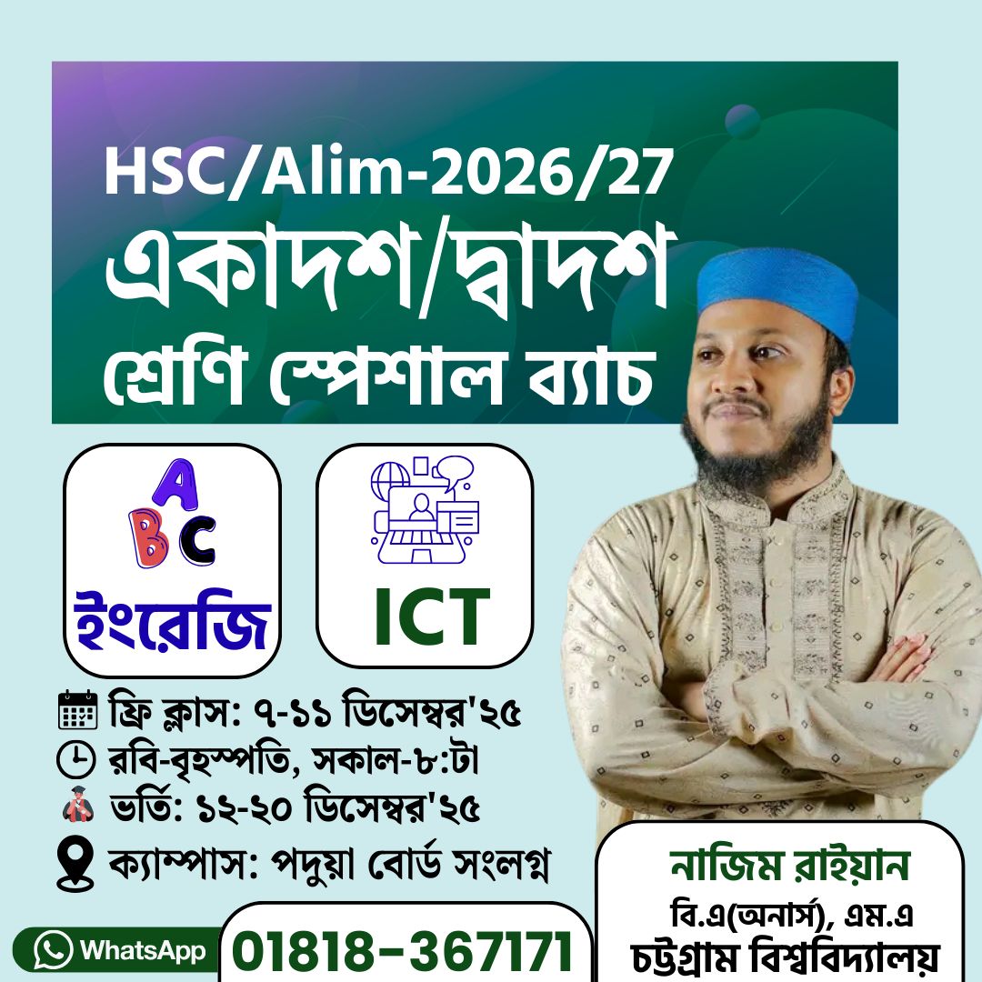 ICTLISH পরিবারে সবাইকে স্বাগতম। HSC ICT ও English নিয়ে আমার দীর্ঘ ৬ বছরের পথচলা। চেষ্টা করি আমার এই যাত্রা বহমান রাখার জন্য। শুভেচ্ছা ও ধন্যবাদ সবাইকে